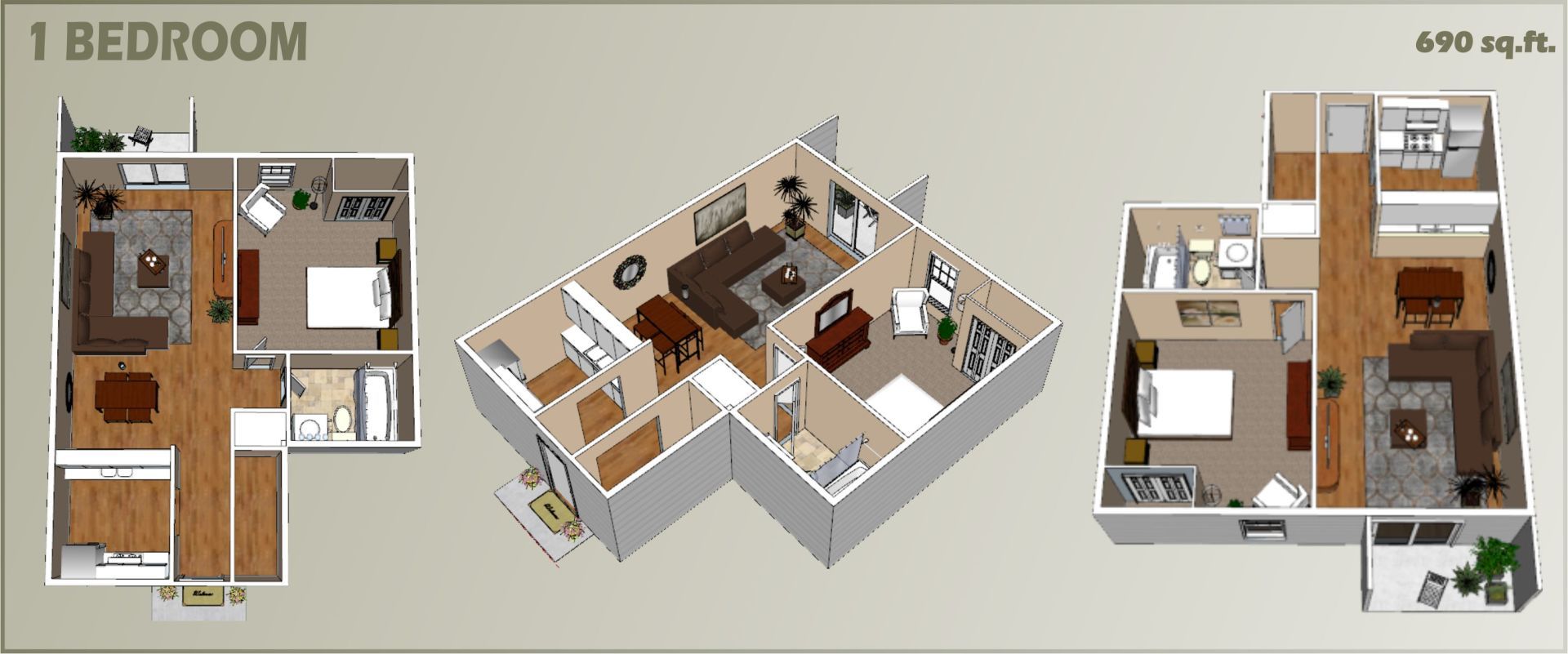 - 1 Bed / 1 Bath 690 Sq.Ft.